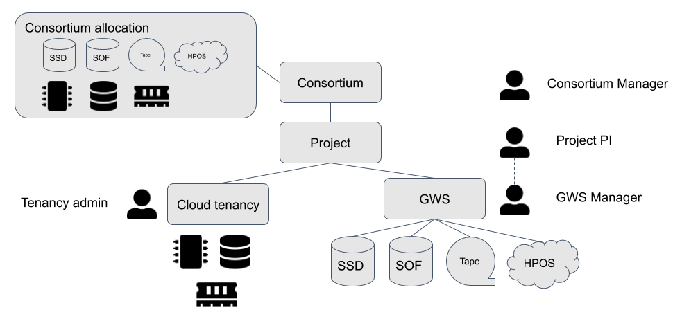 Resources on JASMIN such as storage and compute are allocated to science community “consortia”. Each consortium has a manager: a representative of that science community who is in touch with its major activities and understands the resource requirements for projects in that domain. Representatives of individual projects should discuss requirements with their Consortium Manager, who is best placed to make decisions about the allocation of JASMIN resources within that consortium. Requirements can be documented using the “JASMIN Projects Portal”, but need to be approved by a Consortium Manager before being passed to the JASMIN Team for provisioning.